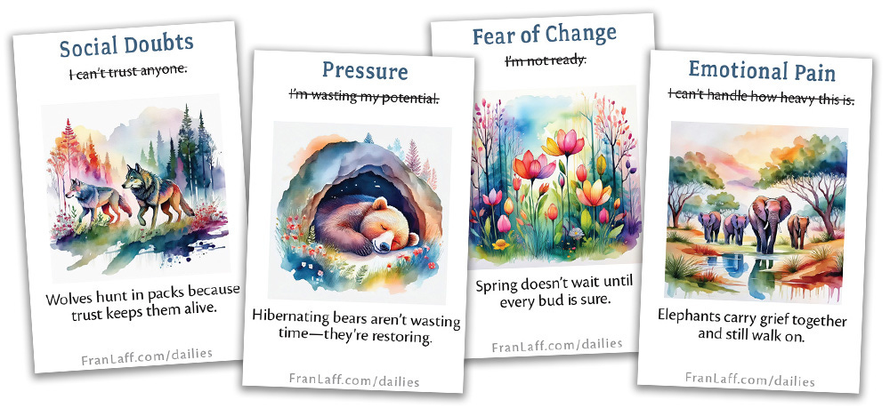 Most of my image sets eventually use one of these “seed” images - what Adobe Firefly calls a style reference. I rename that “seed image” and use it as a style reference every time I want to continue making more images with the same basic “look”. For example, all of my Permission to Pause cards (FranLaff.com/pause) use one style reference image, and all of my Nature-Based Cognitive Reframes (FranLaff.com/reframes ) cards share one other style reference.